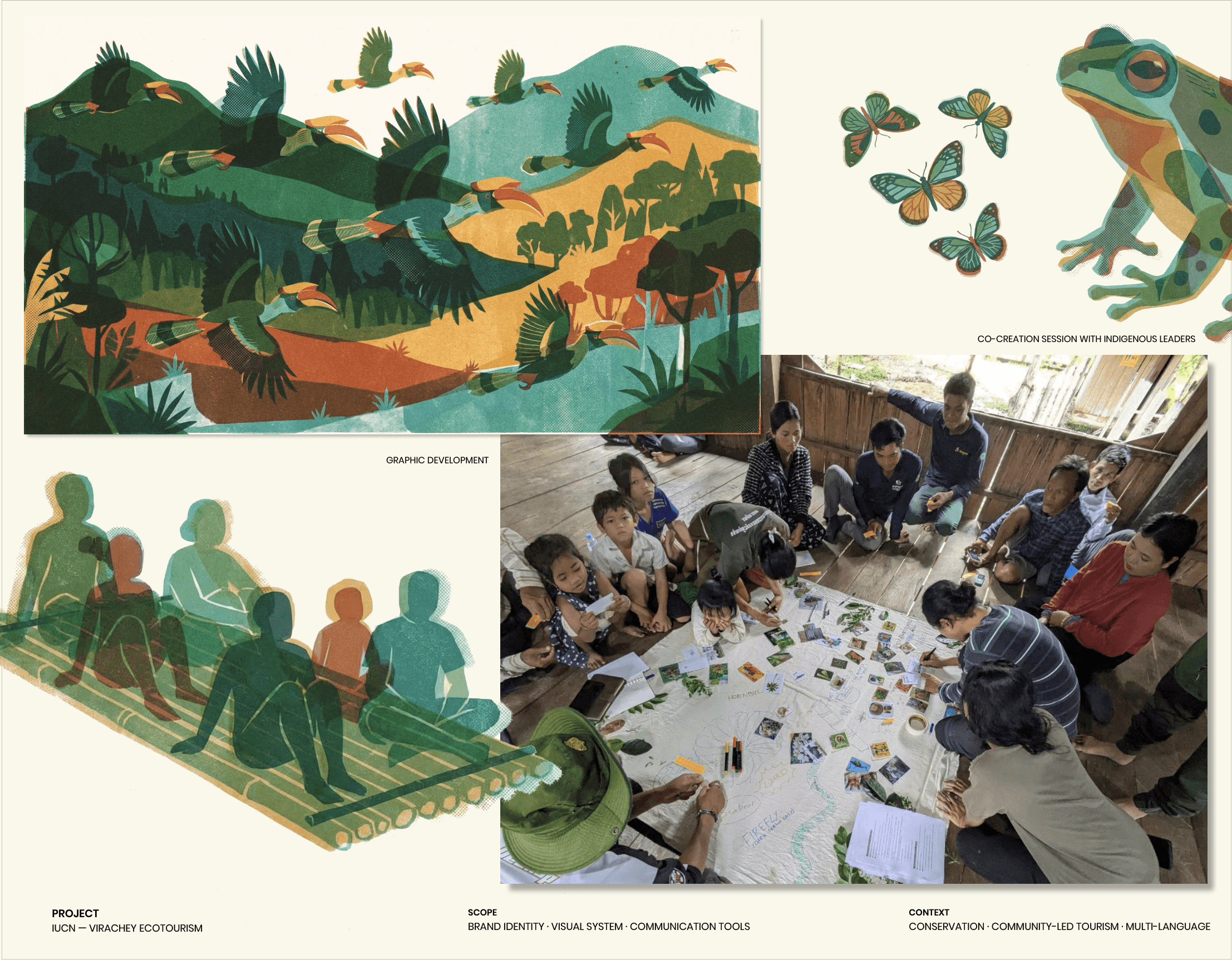 How can an ecotourism brand be truly owned by Indigenous communities while shaping respectful, sustainable visitor behaviour? → By leading a co-creation process with Indigenous leaders across seven ethnic groups, ensuring the brand is rooted in community ownership and cultural knowledge. The identity builds local pride while guiding visitor engagement through storytelling, tradition and ecological awareness. I developed a cohesive visual system and three field-ready guide booklets that translate these principles into a clear visitor journey. The result is a scalable experience that encourages eco-conscious exploration aligned with local customs, strengthening both community ownership and sustainable tourism practices. Cover and landing images by Miguel Jeronimo Additional project photography by Miguel Jeronimo & Shunsuke Miyatake